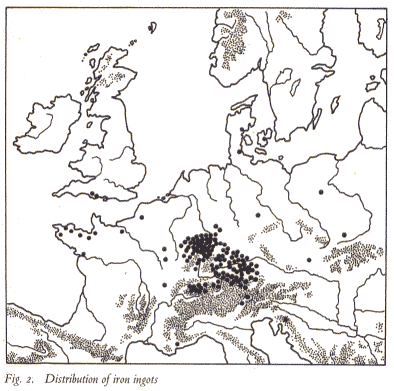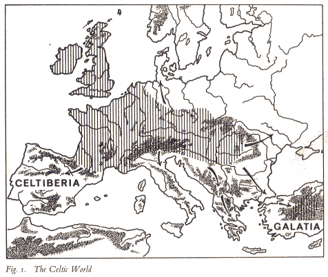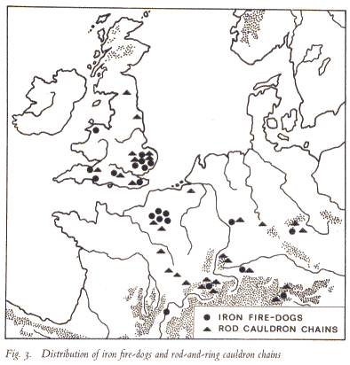 P.37 - The Celtic World: The author talks about a time period around The author states "the evidence shows us the Celts as a people originating (in archaeological terms) in Central and West Central Europe, and by the third century BC established from Iberia in the west to the Carpathians and the borders of the Ukraine in the east, with the Galatian colony as a still more easterly outpost. Southwards they reach to the Alps, and march with the civilizations of the classical world. Northwards they take in the British Isles, and find their northern boundary along the southern edge of the Teutonic, Slav and Finno-Ugrian peoples on a line roughly marked by the modern cities of Cologne, Kassel, Leipzig and Cracow... In terms of geographical regions, Celtic Europe was essentially the southern part of the deciduous temperate forest zone." P.39 - The distribution of iron ingots (mostly around central Europe). The following few pages talk about farming but jumps to a period thousands of years earlier: "The basic structure of such a farming economy [with cereal crops and livestock] had been in existence in prehistoric Europe for five thousand years in the south and east, and nearly four thousand in the north and west. The traction plough, rather than the primitive hoe or digging-stick, had been employed in Britain since the third, and in northern Europe from early in the second millennium BC, and roughly rectangular field-systems can be dated in Britain to the middle of the millennium and some may be earlier: by the last few centuries before the Roman Conquest they are recognizably widespread in southern England." So while the maps of iron ingots and firedogs distributed by the Celts seem to illustrate a migratory direction leading from Central Europe to Britain, the last part of this paragraph paints a different picture - that of the use of the Traction plough being used thousands of years earlier and migrating south-east into the rest of Europe 500 years later. Were these the same people, the so called Celts, or another group of people who arrived on the west coasts of Britain from the far reaches of Scotland to Wales - reflected in the distribution of standing stones. On page 45 the author describes battles between families, clans, tribes or coalitions (such as survived in the Scottish Highlands to the middle of the eighteenth century) as barbaric, but then the farming practices technologically advanced and the types of dwellings (the typical round-house - as opposed to the rectangular, single-roomed dwellings of the Mediterranean) skillfully constructed. To me these seem like two distinct types of people. P.55: Woodlands: P.102: "...Tacitus in his Annals gives