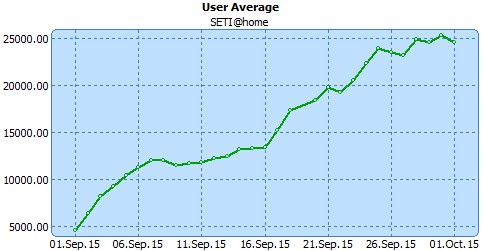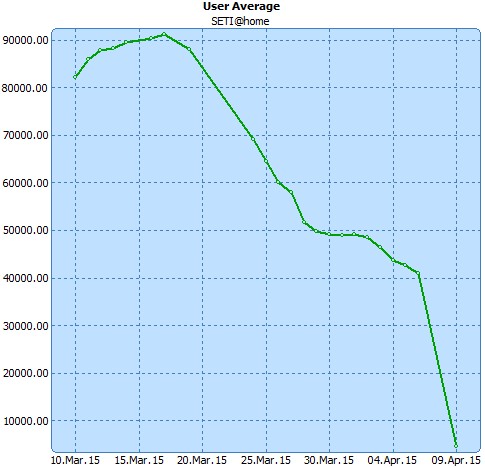 I last blogged about my efforts as a participant in the SETI@home project back in February (see above) when I passed the 100,000,000 credit mark. However, as the weather began warming up in March I started switching most of my computers off, and so my RAC (recent average credit) dropped from 90K to less than 3K.