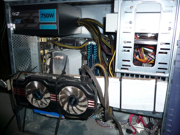 September saw me powering up my small hoard of computers and getting them crunching again after being left abandoned for the warm summer months. I basically had to strip down and rebuild four computers, cleaning out dust, and then juggling graphics cards with power supplies – my Nvidia 680 had a slight hiccup in the process but that resolved itself, and I got my 550W PSU to power two 460s… for a while at least. Sadly, during some shuffling of my twin 460 rig, one of the graphics cards decided to stop working – it powers up but there is no display output, and it wont crunch. I think this was down to me not being so careful with the shuffling, since that card was strapped to a piece of wood with cable ties, and then strapped to the side of the case and linked to the PCI-express socket via a rise cable, similar to this (it keeps the cards cooler when one is out of the case):