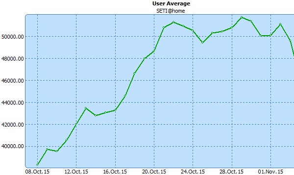 So after having the luck of the 680 almost dying and then not, I have still ended up being a GPU down… but luckily it’s “only a 460” – relatively inexpensive, not so efficient or a great cruncher compared to newer cards. Throughout October my RAC (Recent Average Credit) increased from 25K to 50K where it has now plateaued – I’m still not leaving all rigs on 24/7 as I’m just using them to keep rooms warm during the day, and leaving my house nice and quiet during the night.
