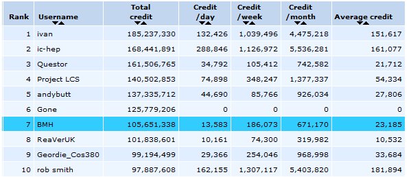 I’m now just scraping in the Top 20 in the team I’m in (GPUUG). I still want to make more headway in the UK rankings – I’m currently 7th in the Total Credit list, but not yet in the Top 10 with my RAC at less than 50K. According to BOINCstats it will take me over a year to overtake the person (Gone) currently in 6th who is no longer participating, and I’m soon to be overtaken by someone who’s RAC is 4x higher than mine – even with all my computers on 24/7 I can do nothing about that, so until then I will drop to 8th.