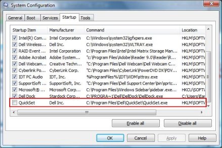 From doing a bit of Googling, it seems the battery warning automatically displays once the laptop/battery is of a certain age and while over time battery life will decrease most users will notice this anyway, and for those that use their laptop plugged into the mains for most of the time, the warning which displays at each login is annoying and seems to me to be an attempt by Dell to talk customers into buying a new battery whether they need one or not. Here's how to disable the warning: It's a startup file that needs disabling. Open System Configuration (Start, type "msconfig"), Click on the Startup tab and disable/deselect the QuickSet item and click OK: |