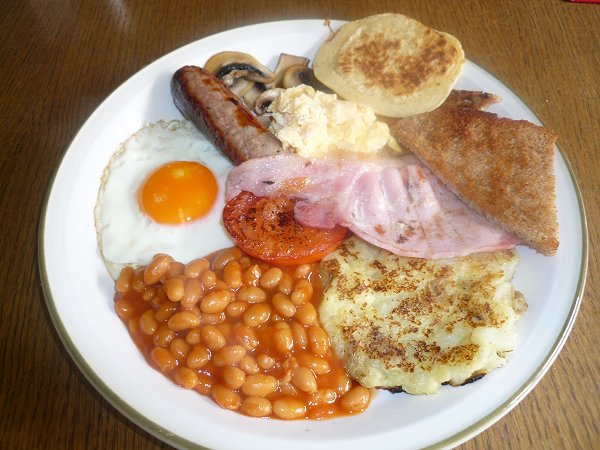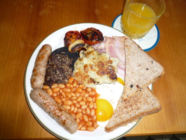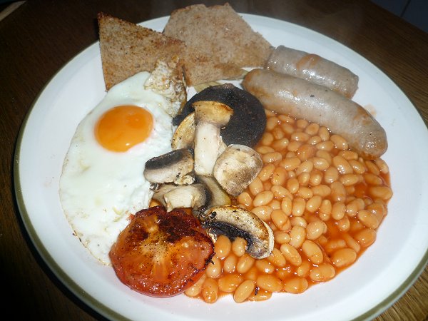 Breakfasts: It's always fun to cook myself a breakfast; it's quite a challenge to time everything right. No two end up the same. This first one includes fried bread/French toast and black pudding, but no bacon.